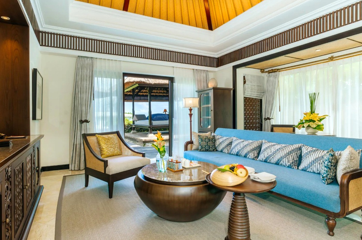298평방 미터의 1베드룸 오션뷰 빌라는 아름답게 가꾸어진 리조트의 정원과 드넓은 인도양이 내려다보이는 눈부신 전망을 자랑합니다. 넓은 실내 공간은 최고급 직물과 맞춤 제작된 예술 작품, 호화 가구로 장식되어 있습니다. 대리석 욕실에서는 언제든 편안한 휴식을 취할 수 있으며, 5성급 특별 편의 서비스로 개인 버틀러 서비스와 VIP 체크인, 락바로의 편리한 이동 서비스가 제공됩니다